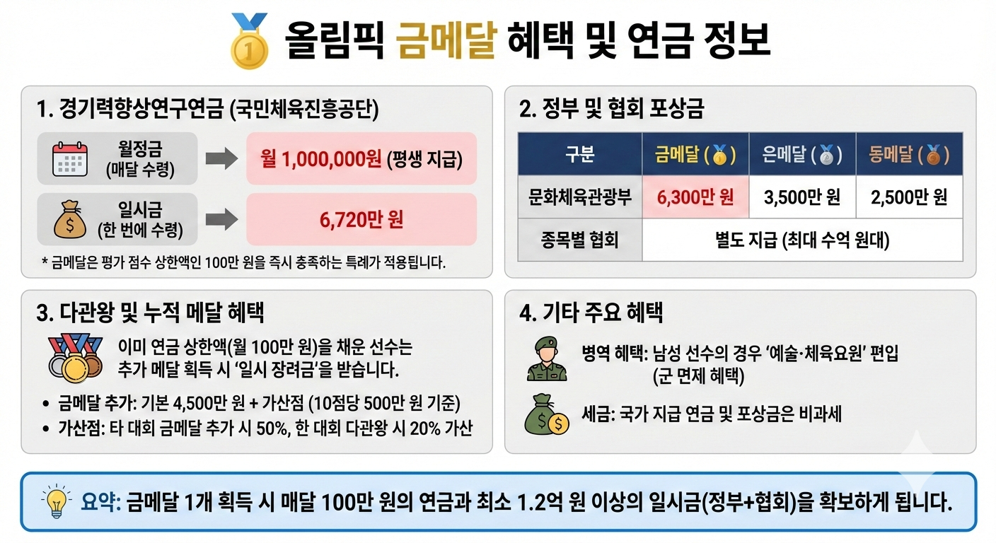 💡 요약: 금메달 1개 획득 시 매달 100만 원의 연금과 최소 1.2억 원 이상의 일시금(정부+협회)을 확보하게 됩니다.